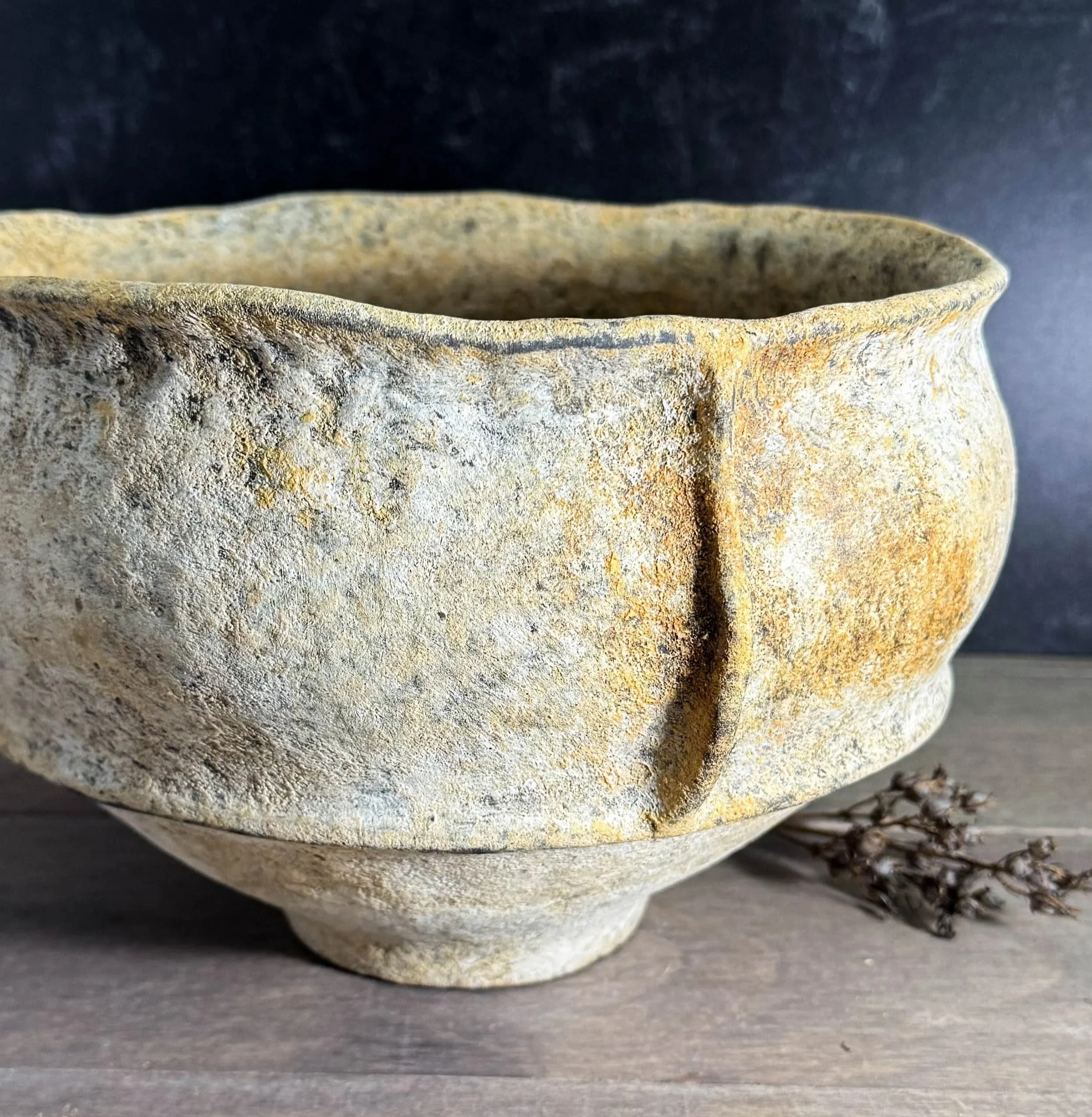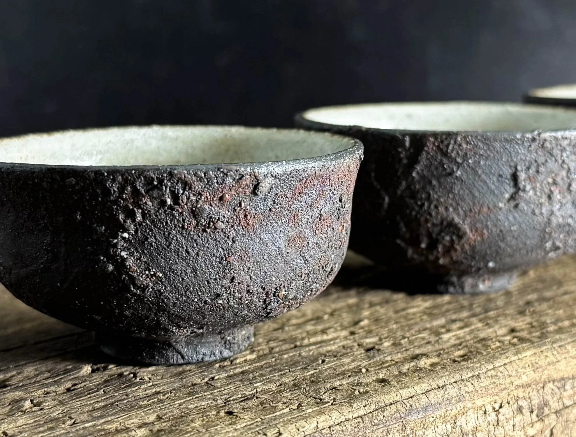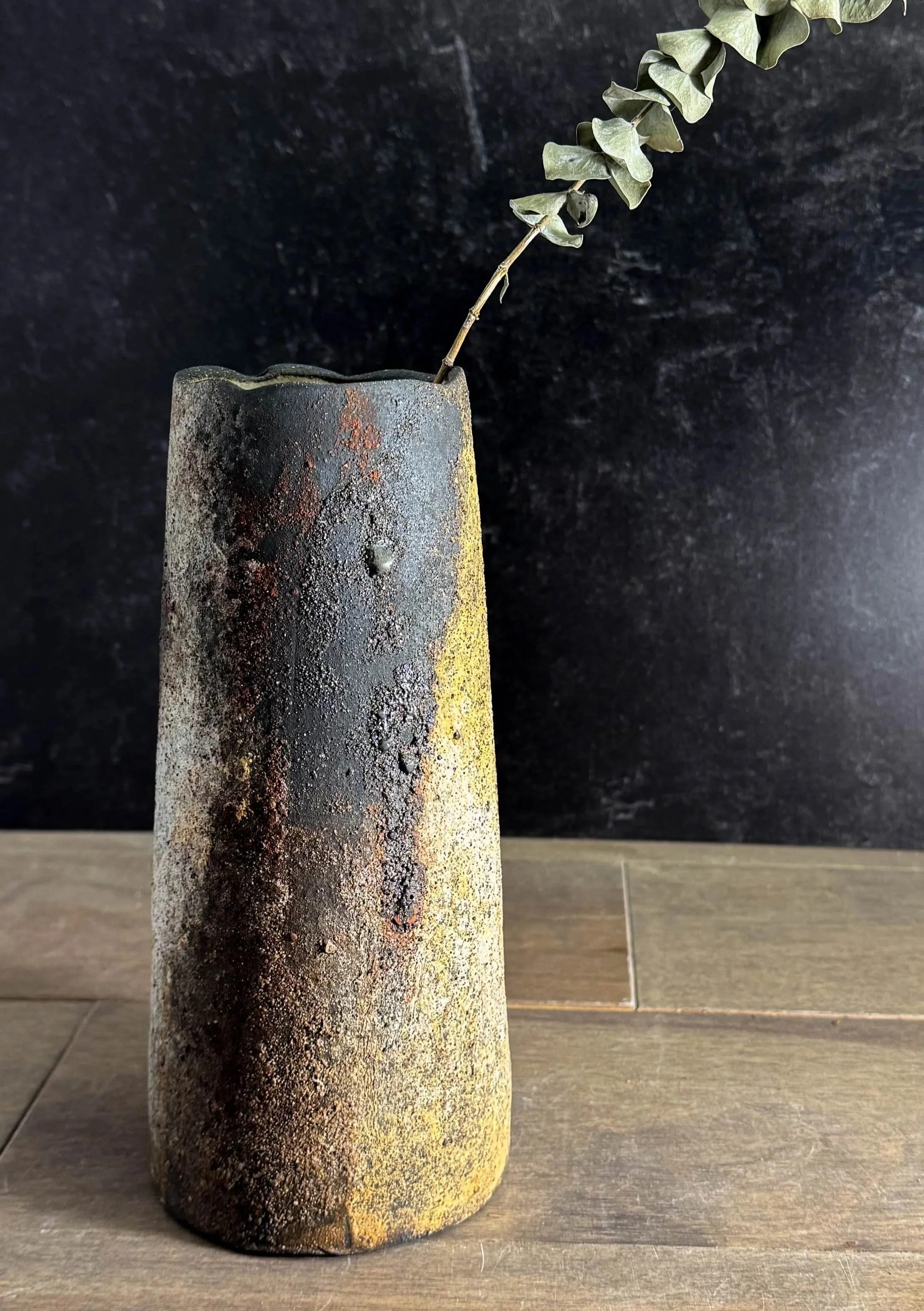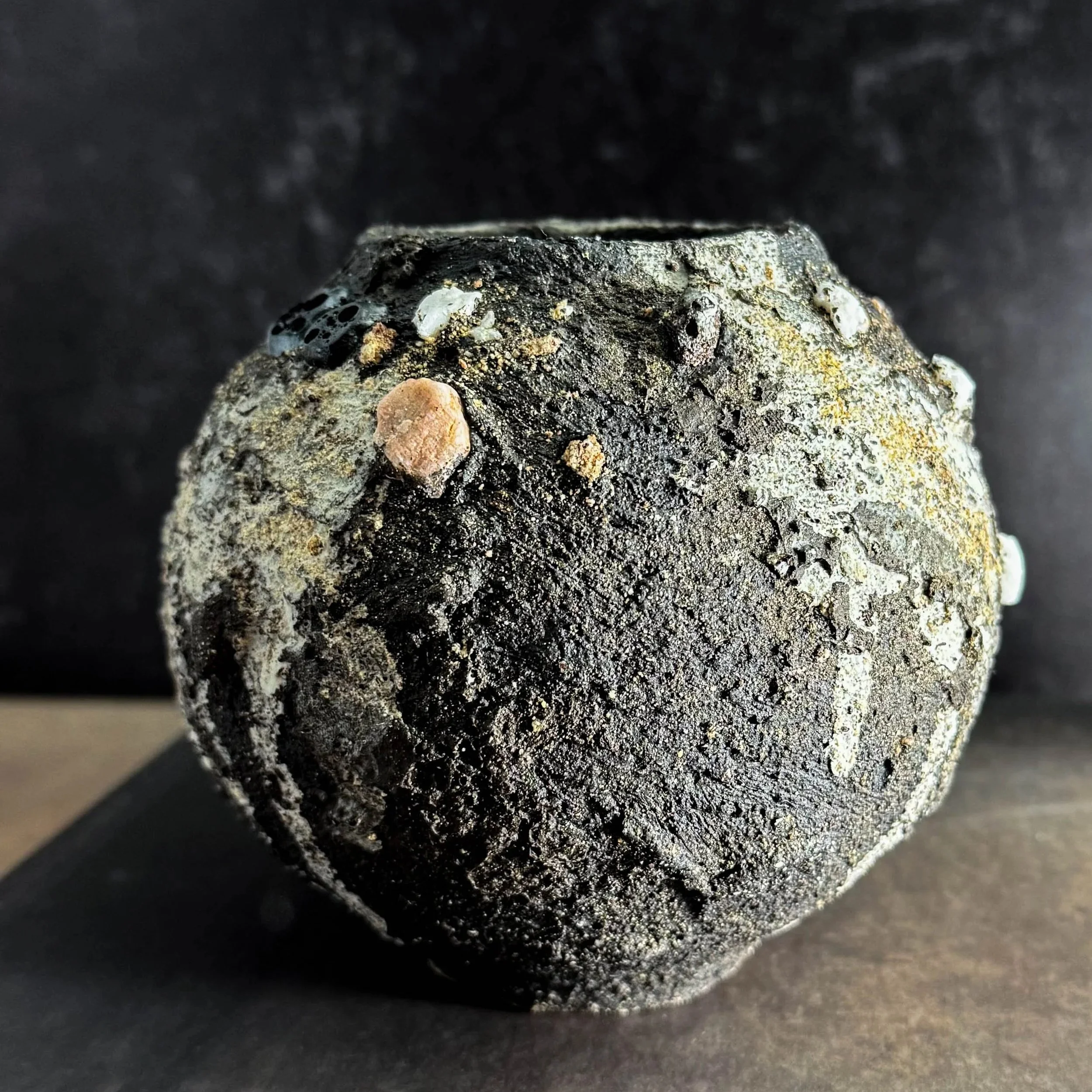 She is a wheel-thrower, coil-builder, and kurinuki-lover who uses dark clay bodies, slips and slip application processes to create natural canvases. Her surfaces feature unconventional aggregates and textural additives including Icelandic volcanic ash and lava rock, Bolivian wild clay, and locally-gathered, sands, rocks, minerals, bricks, clays and gardening aggregates. All of the breathtaking natural terrains she’s admired in her travels inspire her textures, and she draws form inspiration from Japanese, Scandinavian, and South American design.